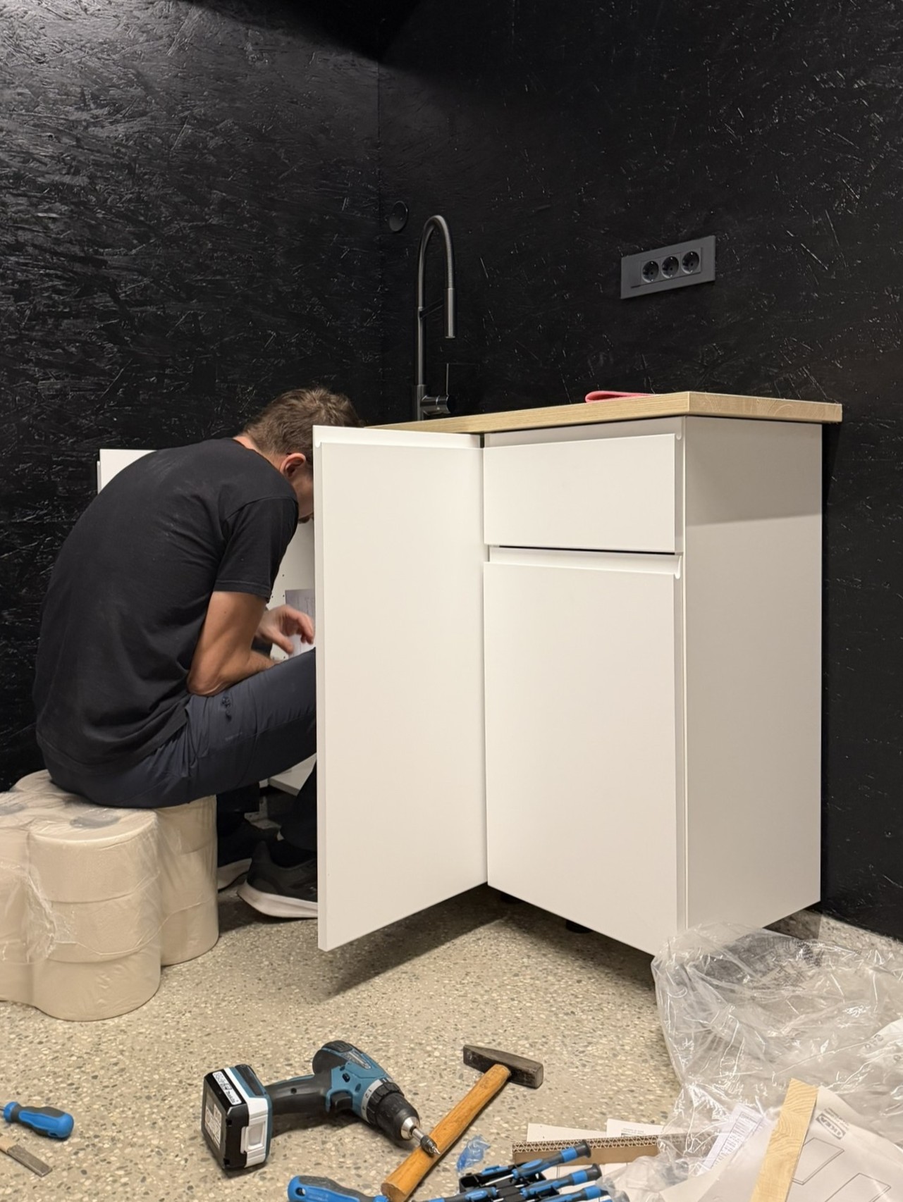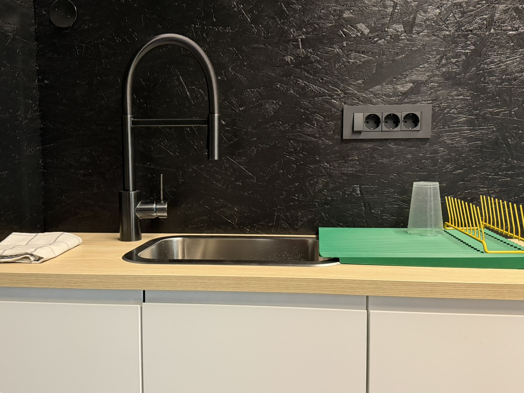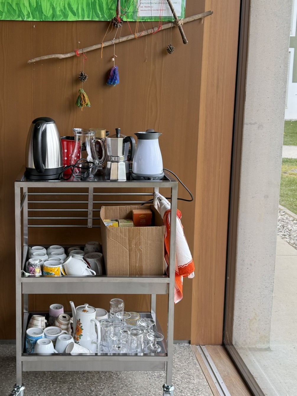 V tujih praksah so kuhinje del običajne opreme skupnostnih prostorov. V idealnem scenariju so dovolj velike, da omogočajo souporabo, skupno organizacijo obrokov in druženje ob pripravi hrane. V obstoječem paviljonu vzpostavitev takšne kuhinje zaradi prostorskih pogojev ni bila mogoča. Smo pa zato na mestu, kjer so arhitekti že predvideli čajno kuhinjo, postavili manjšo kuhnjico z osnovnimi funkcijami ter poskrbeli za mobilne kuhinjske pripomočke (kuhalne plošče, grelnik vode, itd.). Tako je postal paviljon malo bolj domačen in gostoljuben.
